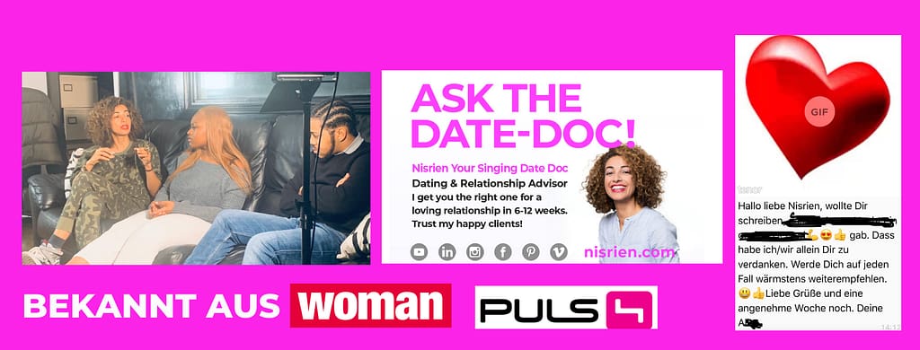 Interviews, Podcasts, TV, Vlogs, Guest Speaker Nisrien The Singing Datedoc More about Dating after divorce here in my BLOG. Nisrien The Singing DateDoc Black Austrian TV